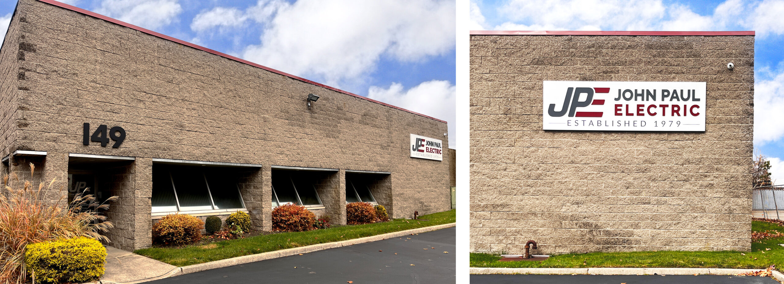 Photo 1 is a long brown brick building with several long windows. Over the front door is a large black PVC sign reading “149”. At the opposite end is a large white panel sign with the John Paul Electric logo in dimensional letters.